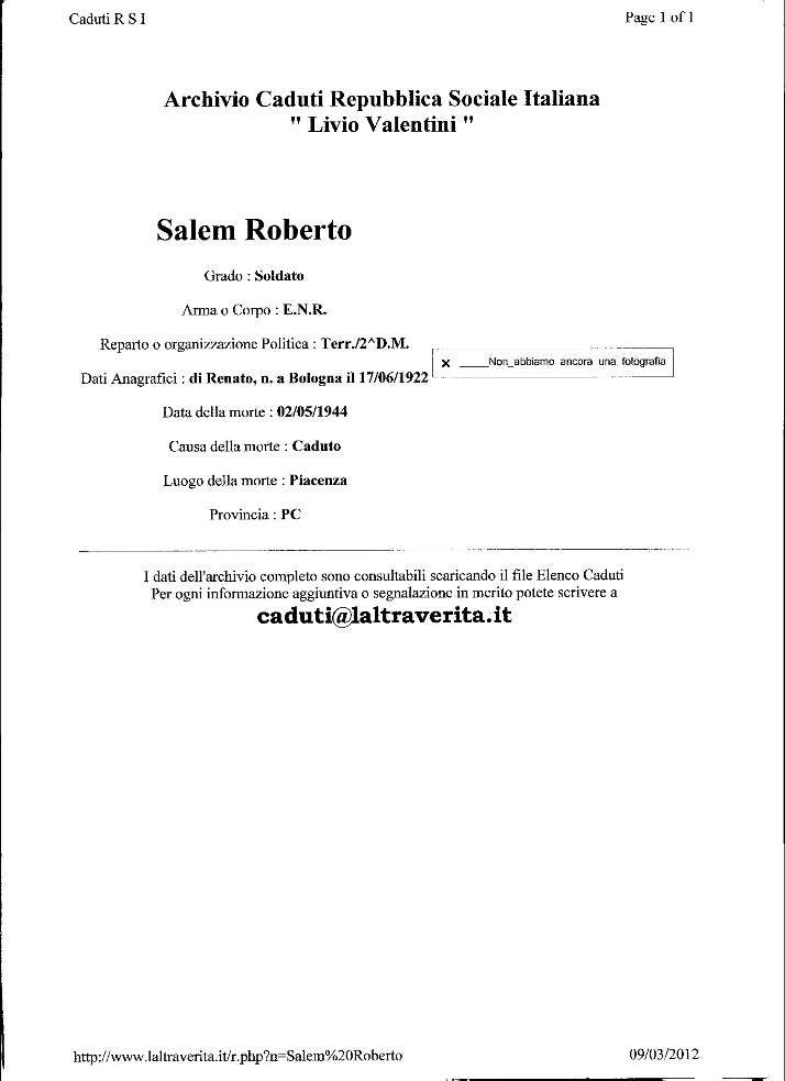 La pagina dedicata a Roberto Salem sul sito laltraverità contenente il martirologio dei caduti della Repubblica Sociale Italiana.