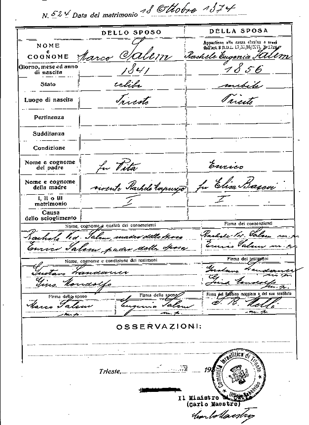 Il 18 ottobre 1874 Eugenia Rachele aveva sposato a Trieste Marco Salem, fratello di suo padre, dunque suo zio.