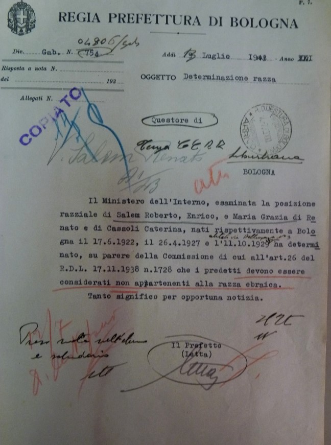 Per Renato, l’unico dei fratelli Salem ad avere figli ( quattro, ma solo tre viventi al momento delle leggi razziali ) si aggiungerà anche il problema della definizione della loro appartenenza razziale.