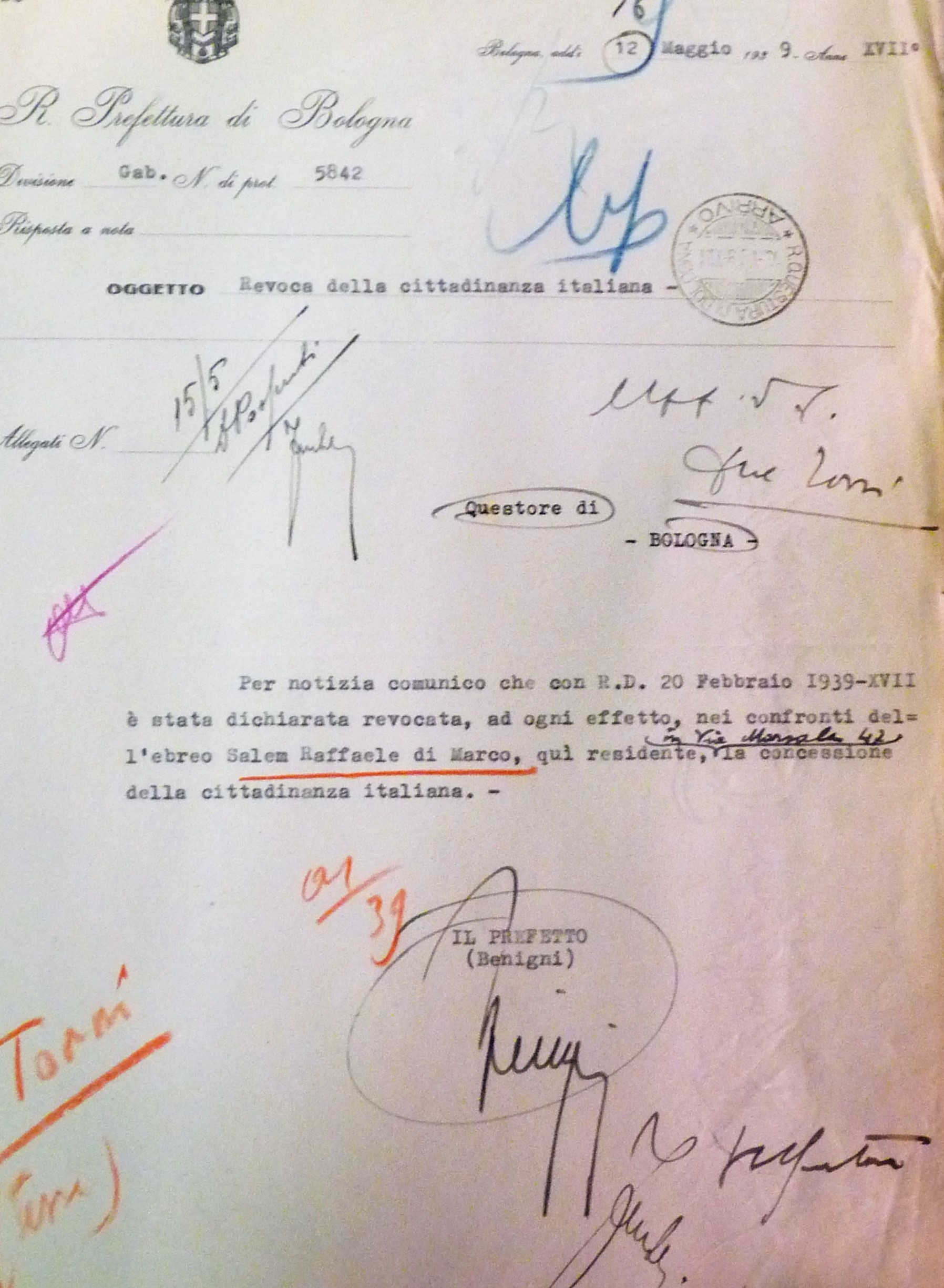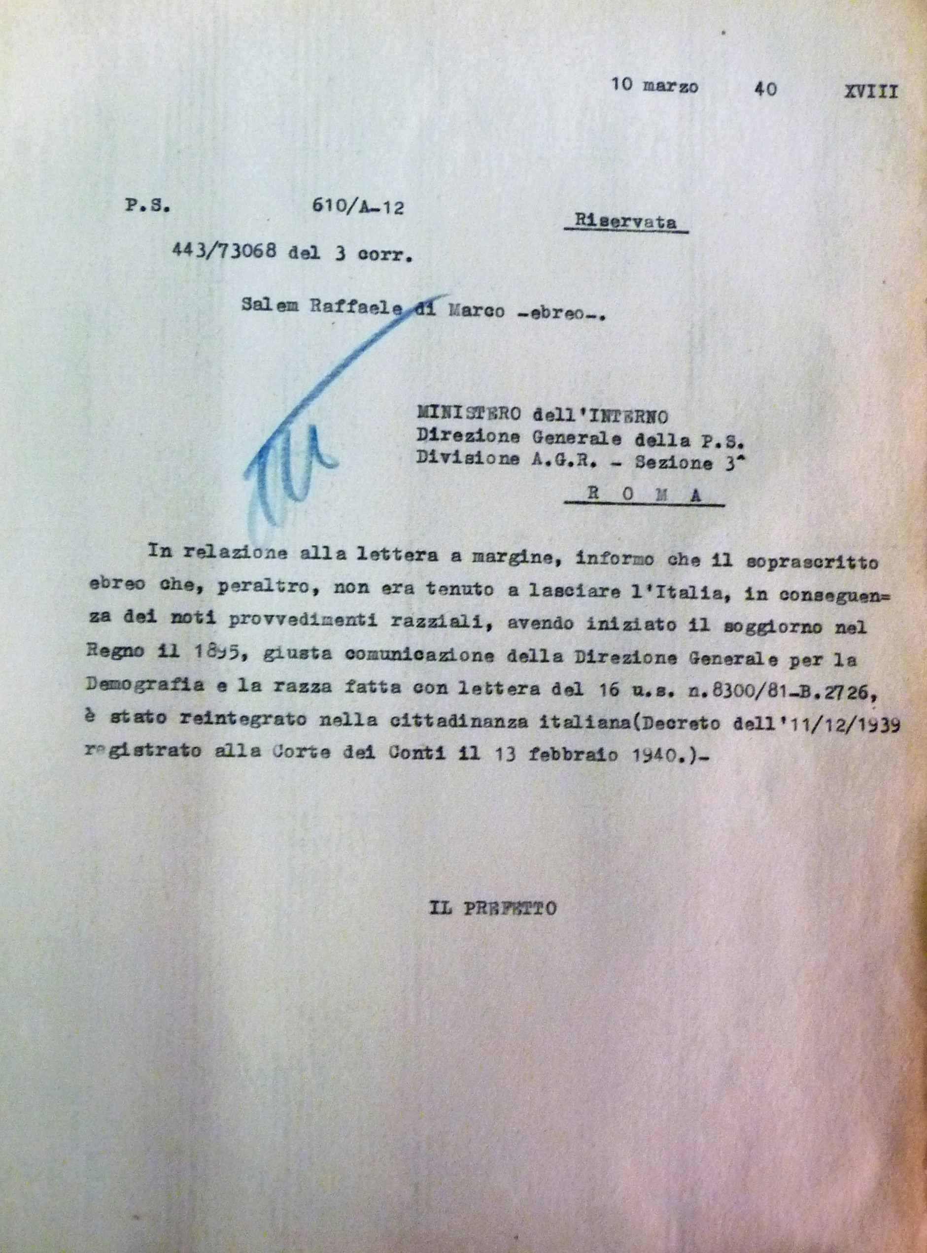 Innanzitutto i provvedimenti di espulsione dall’ Italia degli ebrei stranieri, scattati nel ’39, rimetteranno in discussione il provvedimento che aveva concesso loro la cittadinanza italiana, perché intervenuto dopo il ’19. Perciò la concessione della cittadinanza viene revocata nel maggio del ‘39 sia a Raffaele (vedi doc. sotto) che a Renato.
