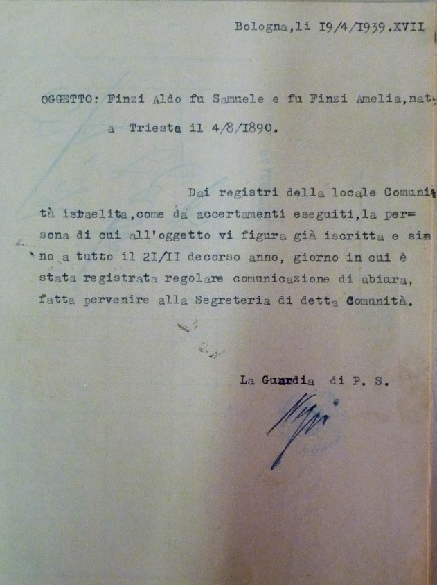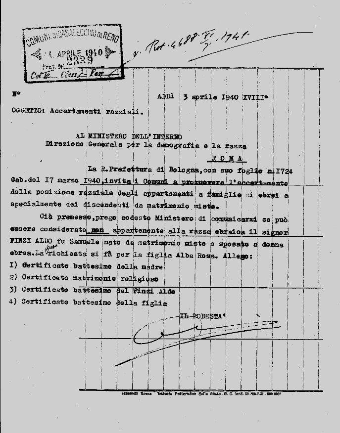 Poi, dopo che il 17 marzo 1940 la Prefettura di Bologna aveva invitato i Comuni a promuovere l’accertamento razziale degli appartenenti alle famiglie di ebrei e specialmente dei discendenti da matrimonio misto, come Aldo Finzi e la figlia Anna Rosa, inizia un tira e molla burocratico in cui reiteratamente il Comune di Casalecchio, probabilmente su sollecitazione della famiglia Finzi che presenta una varia documentazione, chiede delucidazioni anche direttamente al Ministero degli Interni sulla situazione di Aldo Finzi e figlia, soprattutto se possano essere considerati non appartenenti alla razza ebraica (vedi doc. sotto).