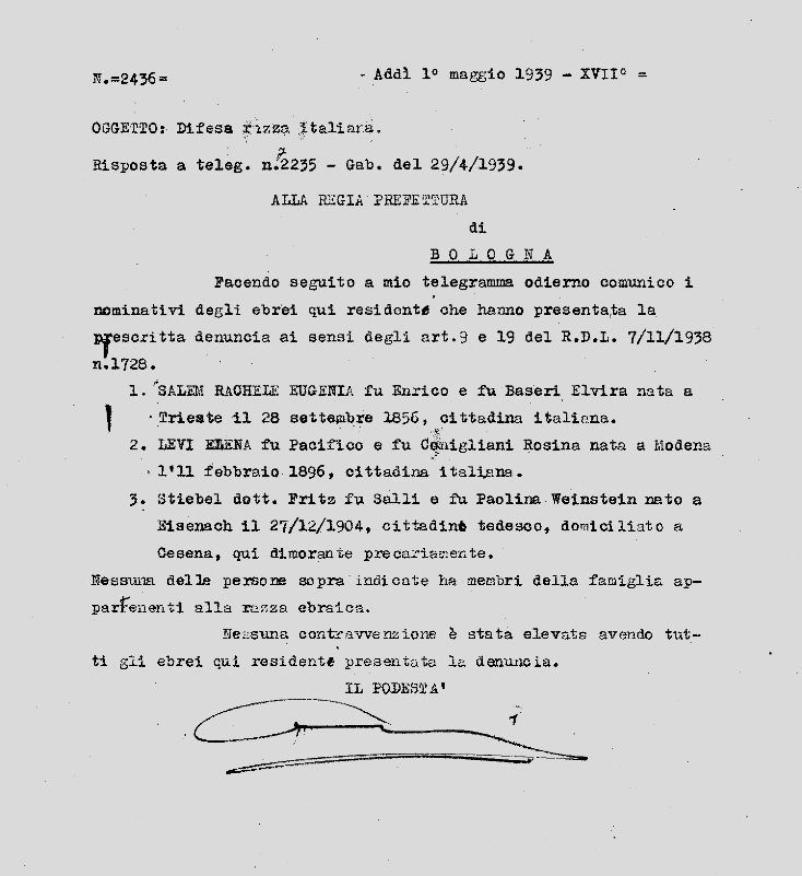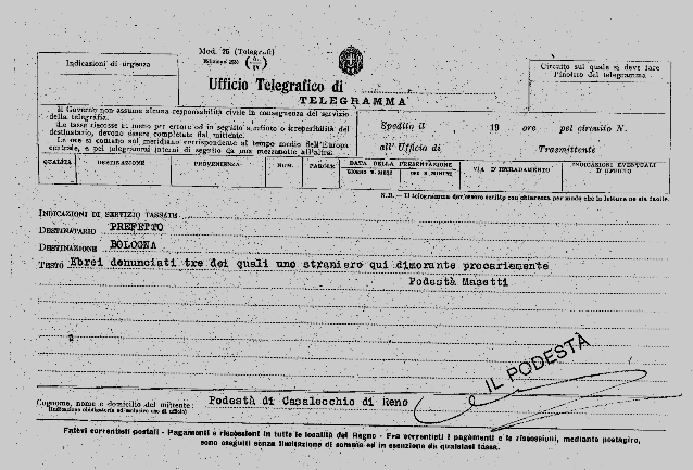 In risposta ad un telegramma inviato dal Prefetto Guerra il 29 aprile del ’39 (vedi § 3.0. ), che ricordava ai podestà l’obbligo di mantenere costantemente sotto controllo le presenze degli ebrei e le loro autodenunce, veniamo a sapere dalla risposta del podestà di Casalecchio Masetti, datata 1° maggio 1939, che oltre a Eugenia Rachele Salem ed Elena Levi, nel comune è presente anche un altro ebreo, straniero, di nome Fritz Stiebel.
