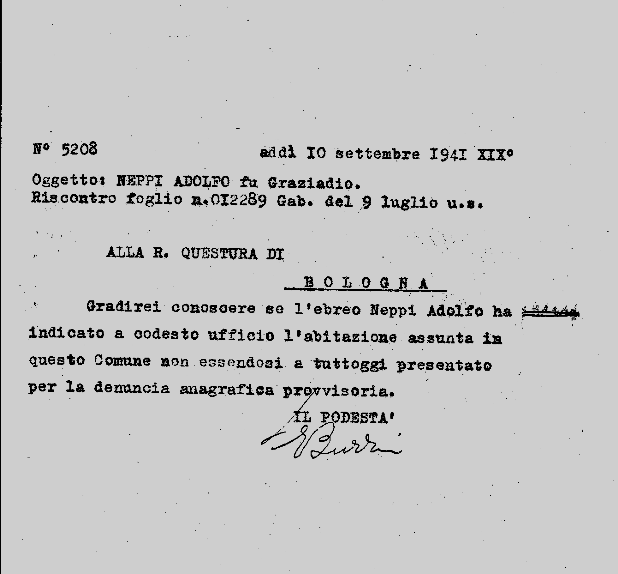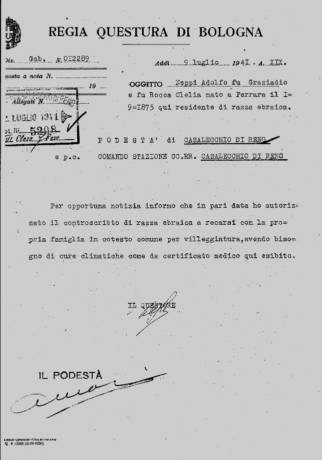 Così Adolfo Neppi arriva a Casalecchio con la sua famiglia nell’ estate del 1941, “autorizzato” ad andare in villeggiatura dalla Regia Questura di Bologna.